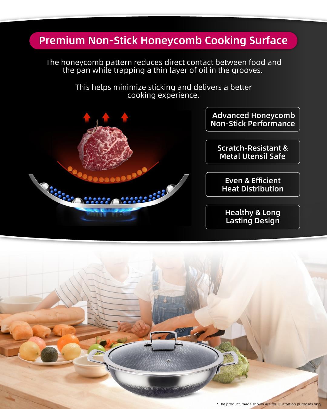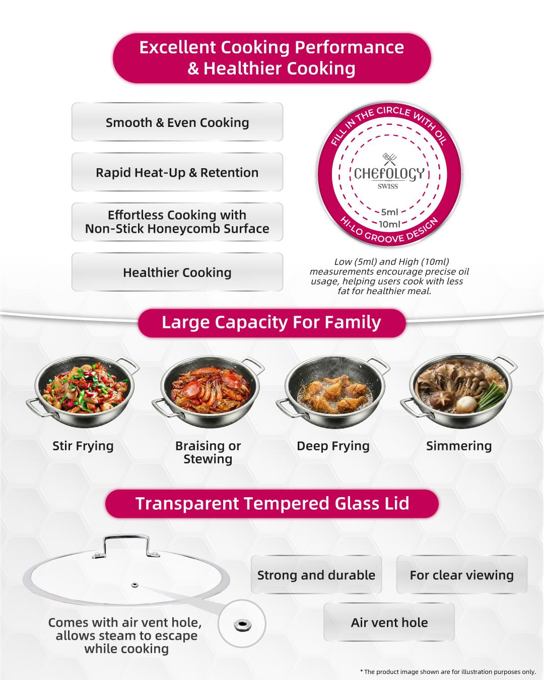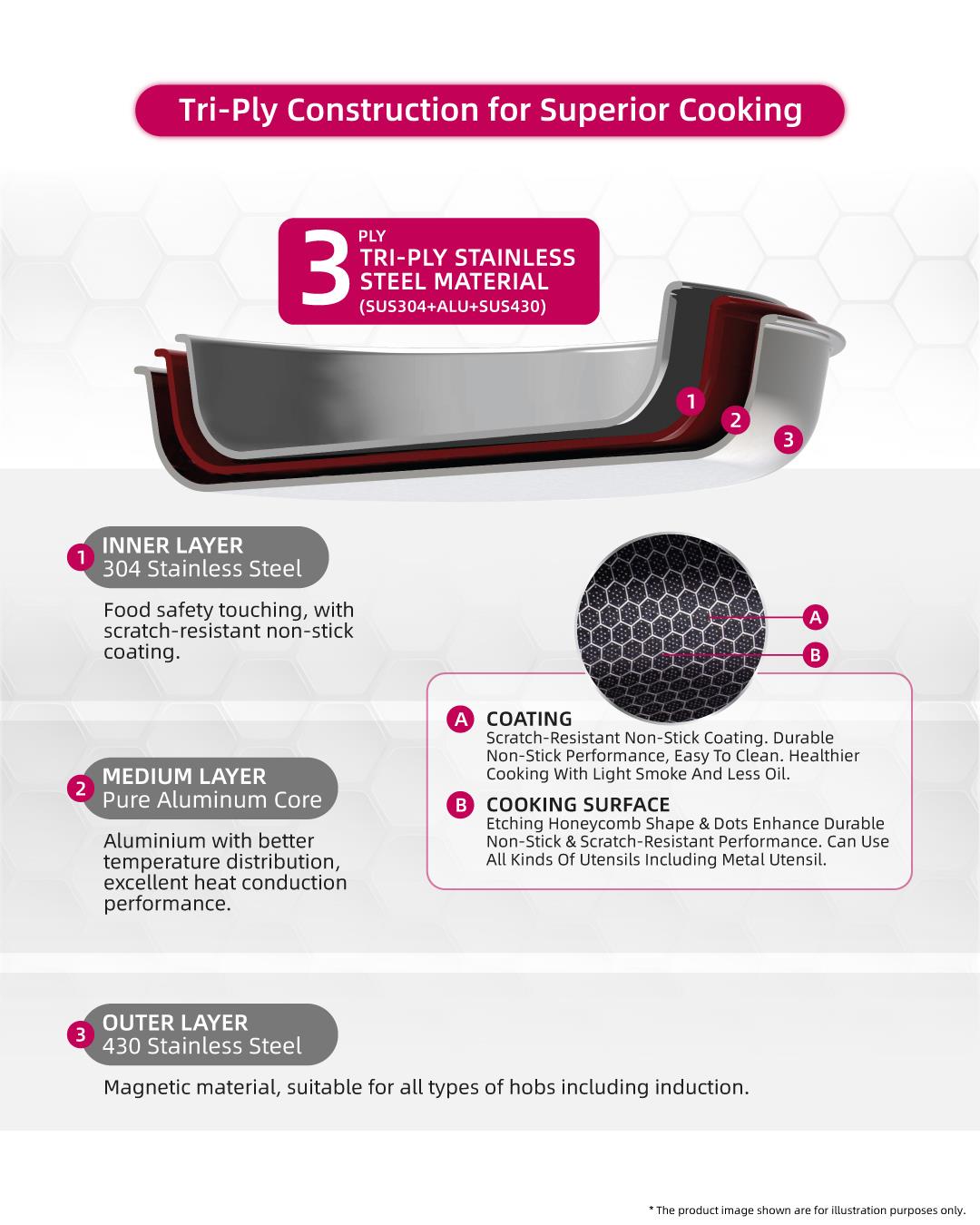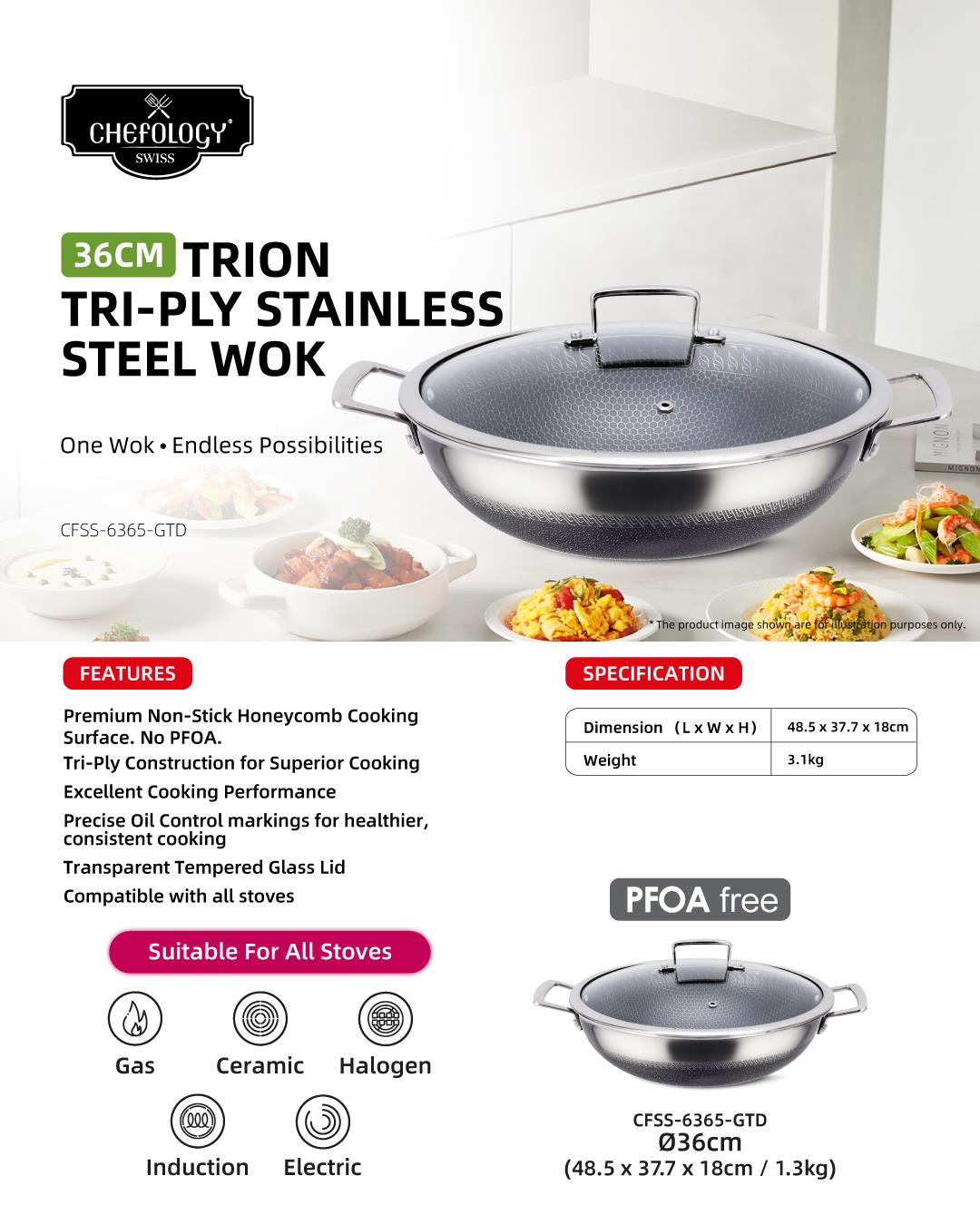 Chefology Trion Triply Stainless Steel 36cm Wok Free Kitchen Hanging Towel (Red)