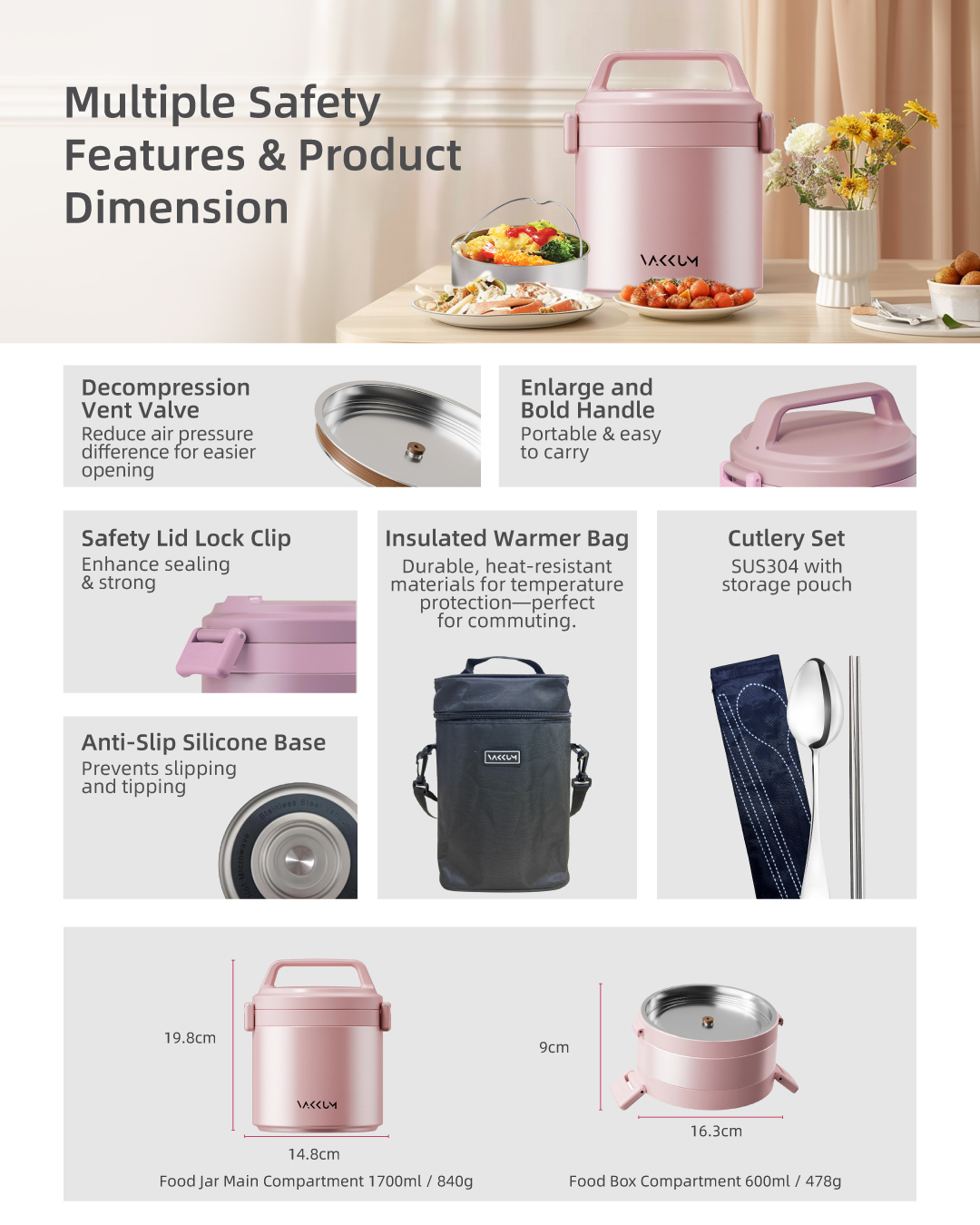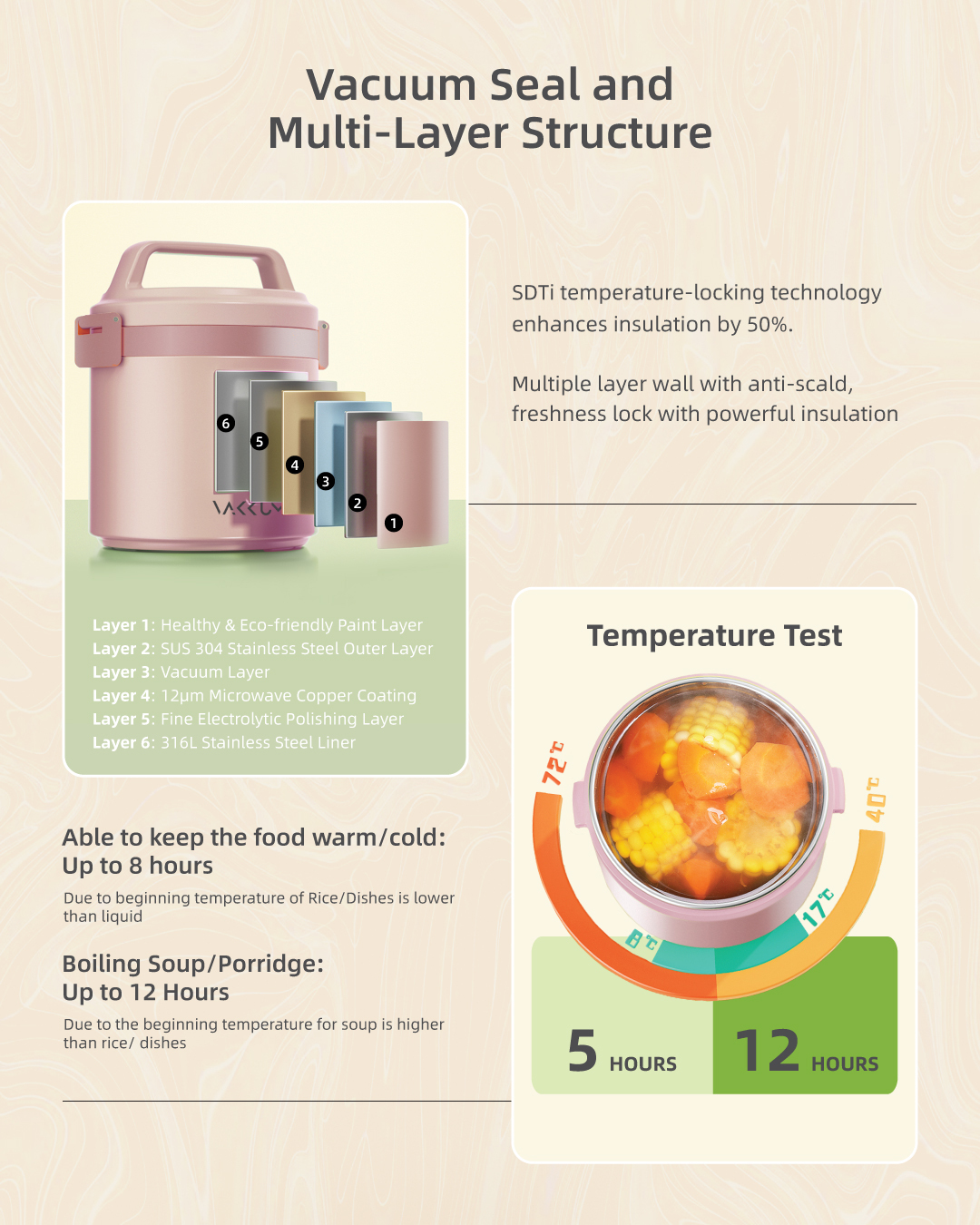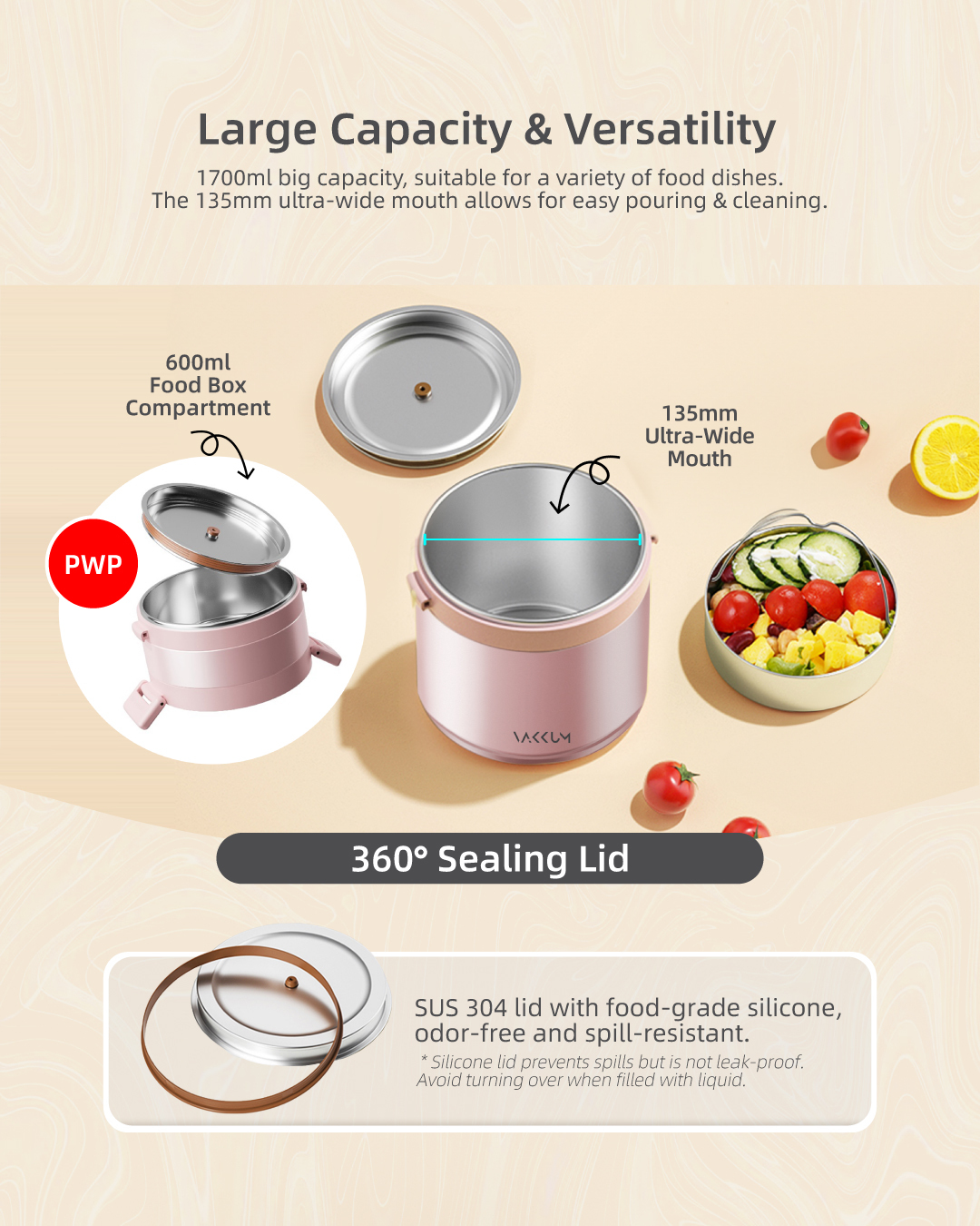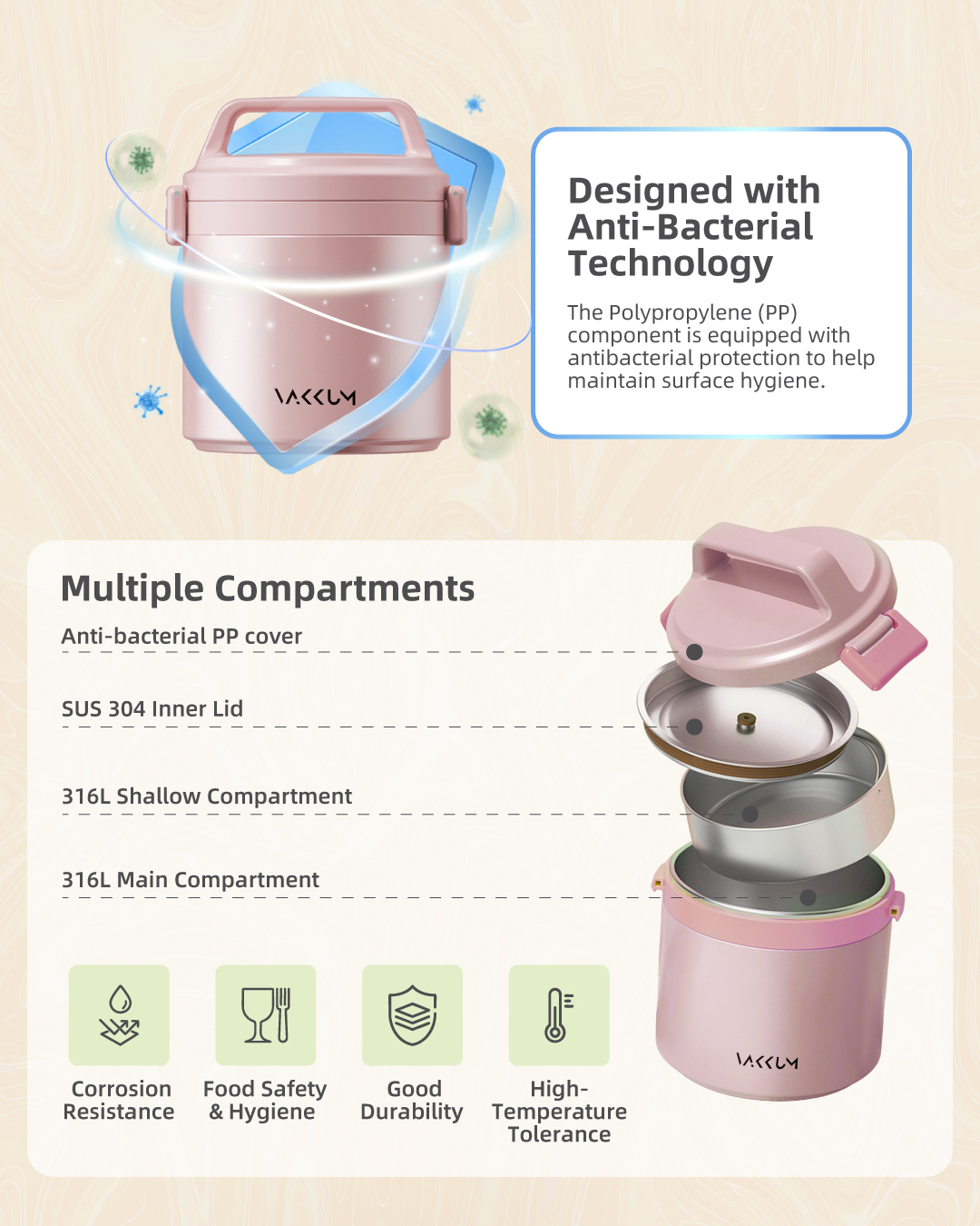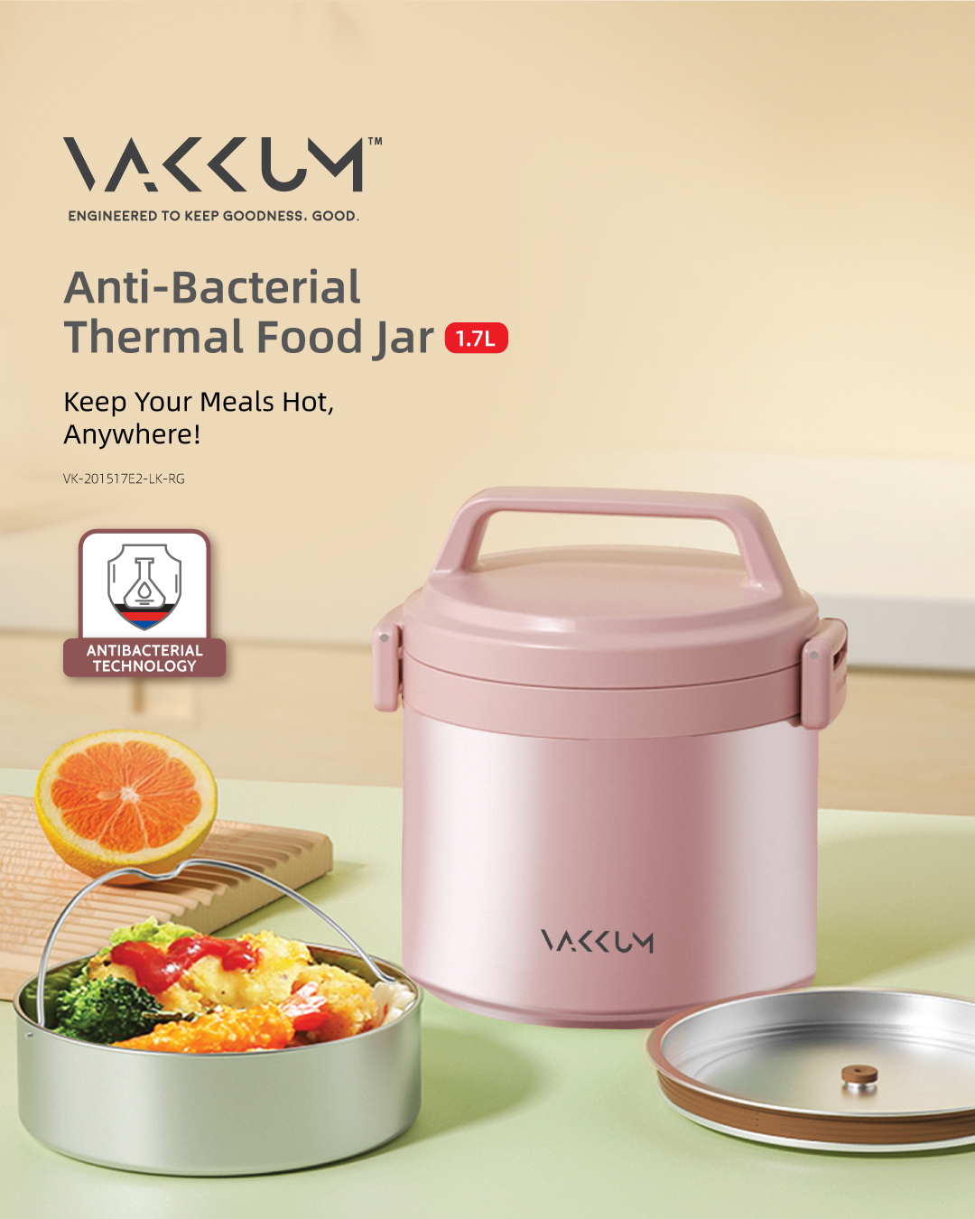 Vakkum Anti Bacteria Stainless Steel 316 Thermal Food Jar 1.7L (Rose Gold)